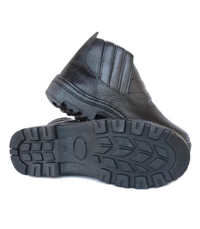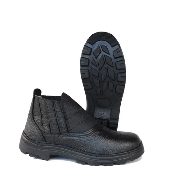 Botina de raspa (couro) cabeça, prensa relax, misto hibrido, fechamento lateral com elásticos encobertos, solado de borracha, colado, prensado e costurado lateralmente com Bico de PVC.